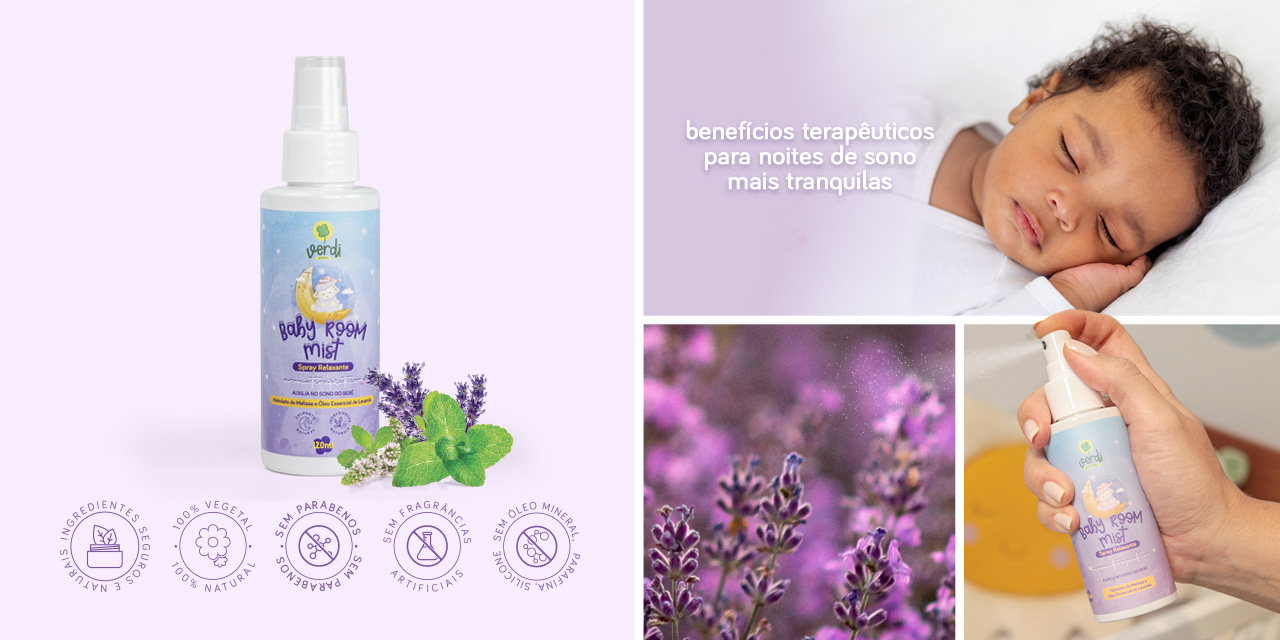 O Baby Room Mist foi desenvolvido com hidrolato de melissa e óleo essencial de lavanda, combinando os benefícios terapêuticos naturais desses ativos para proporcionar relaxamento, tranquilidade e um sono mais calmo para toda a família.