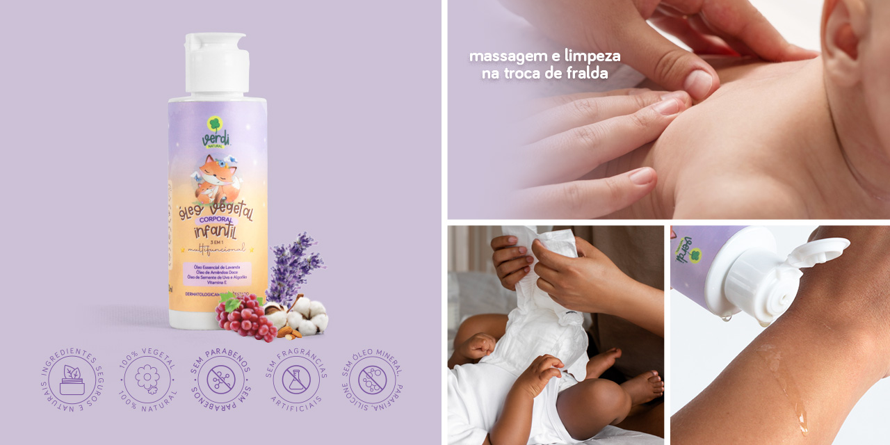O Óleo Vegetal Corporal Infantil Natural foi desenvolvido para limpeza, massagem e hidratação da pele sensível de bebês e crianças. Sua fórmula 100% natural combina óleos vegetais e essenciais cuidadosamente selecionados para proteger, nutrir e reforçar a barreira natural da pele.